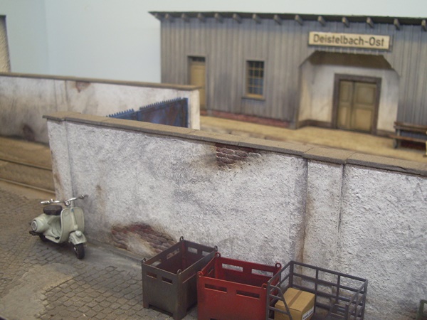 NEU 10.12.2017 Nach längerer Pause ging es wieder in Deistelbach Ost weiter. Ich habe das Gebäude des Tanklagers gebaut, es ist so angelegt das man von der Vorderseite in das Innere schauen kann. Das Gebäude ist im kompletten Selbstbau aus Kappa Platten, Balsaholz und Karton entstanden. Die einzigen gekauften fertigen Teile waren die Ziegel von Kreativ3.De-Modellbau , Türgriffe, Fenster, Lichtschalter, Lampen und der Feuermelder von Addie. Des weiteren entstand das Tor des Tanklagers aus Polystyrol mit selbstgebauten Scharnieren...es fehlen aber noch so einiges an Kleinigkeiten...den Hydrant habe ich als Fertigmodell bei Asoa gekauft...