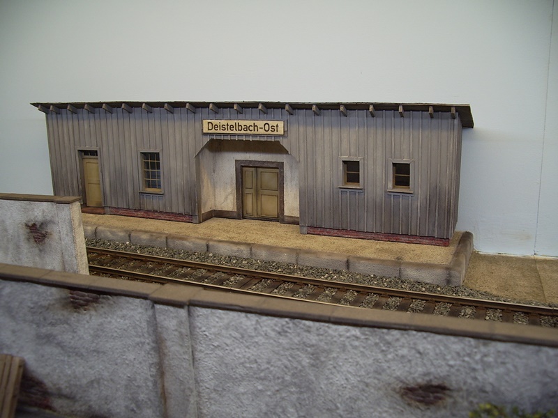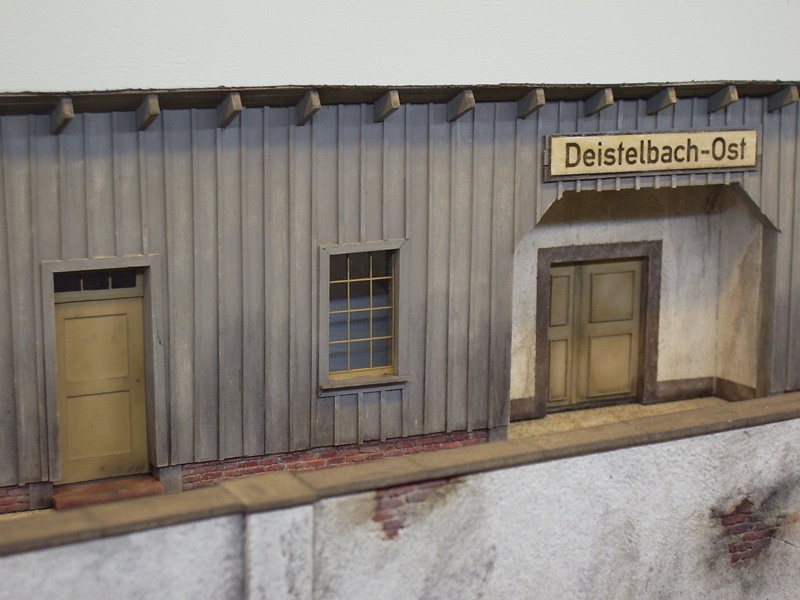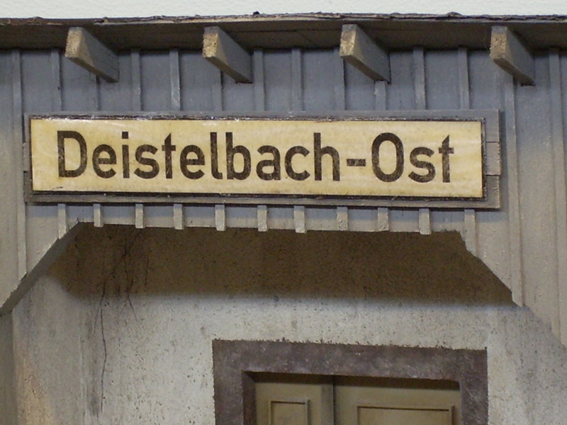 NEU 05.02.2017 Es geht weiter mit dem Bau des Empfangsgebäude Deistelbach-Ost. Fenster und Türen wurden eingesetzt, es ist alles aus Balsaholz, Kunstoff und Karton im Selbstbau entstanden, einzig das eine Große Fenster ist ein gekauftes Teil. Das Bahnhofschild wurde auf Papier gedruckt und dann auf ein Balsaholzbrettchen aufgeklebt bei dem ich die Wölbung zurecht geschliffen habe damit es aussieht wie ein gewölbtes Emailschild ist. Danach kam noch für den Glanz Bootslack drüber... Es fehlen noch Kleinteile...Türgriffe...