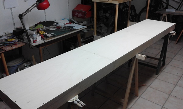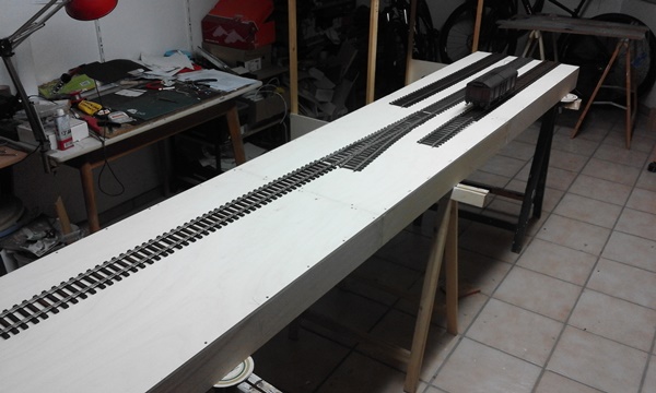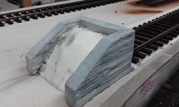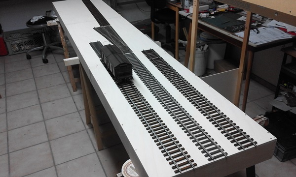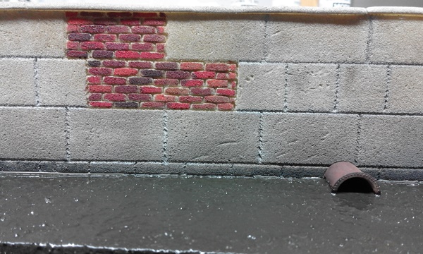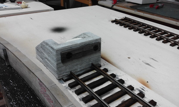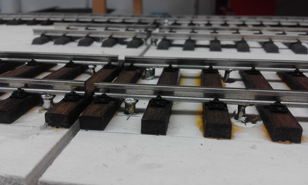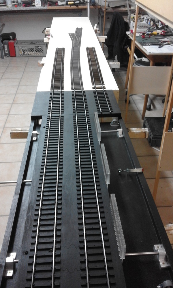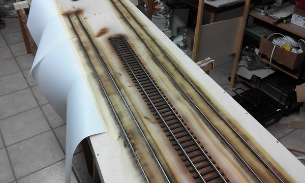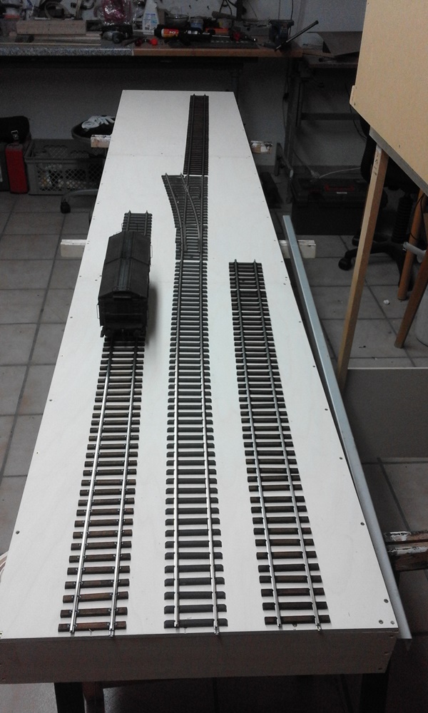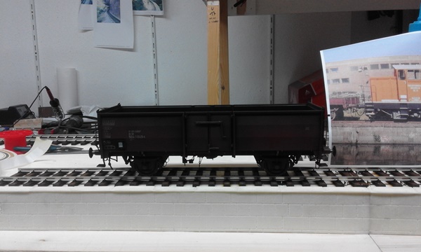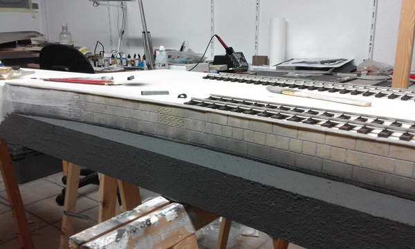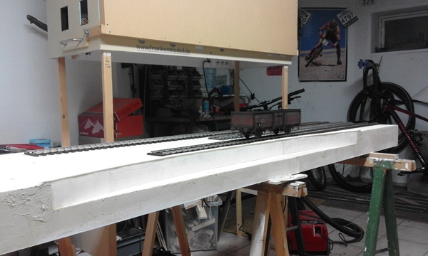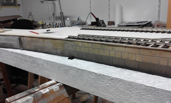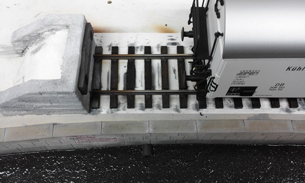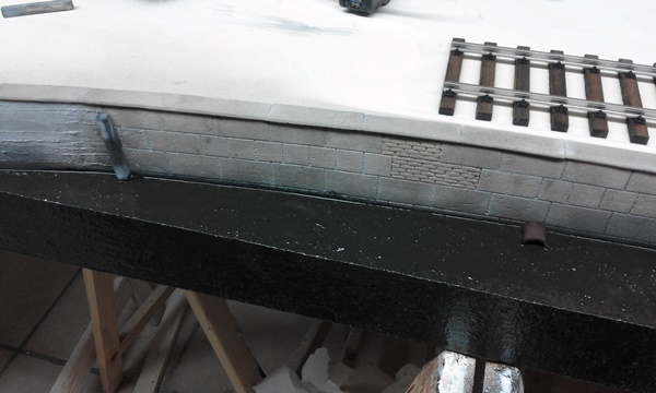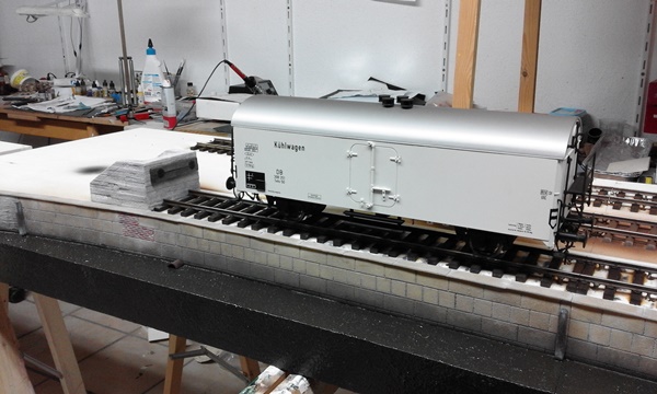 NEU 25.3.2016 Die Kanalmauer habe ich weiter farblich behandelt. Die Wasserstruktur habe ich mit Acryl aus der Tube gestaltet, mit einem Pinsel verteilt und getupft. Danach mit Abtönfarbe in grün/braun gestrichen und zum Schluss Bootslack drüber. Der Prellbock Vorbild Deistelbacher Industriebahn :-) ist aus einem Modur Block entstanden, farblich ist dieser noch nicht fertig und wird noch mit Steinen verfüllt... Die Schwellen wurden abgeklebt und die Profile wurden dann mit dem Airbrush lackiert... das Stahlschwellengleis komplett... Von Kiss habe ich mir einen Kühlwagen zugelegt, er braucht aber noch einiges an Verfeinerung und eine Epoche IV Beschriftung...