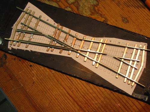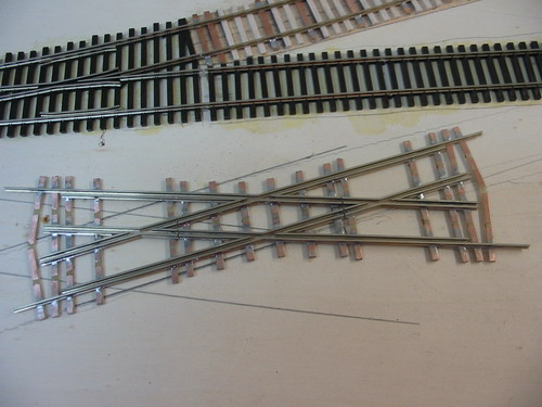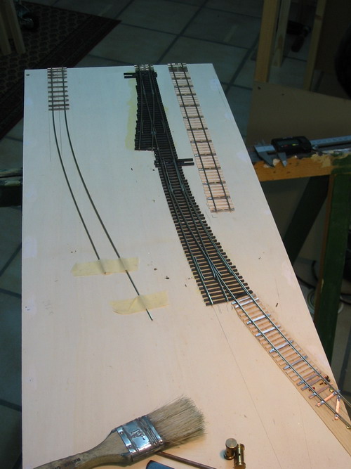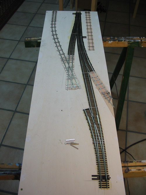 Ich habe mit dem Bau dem dritten Anlagenteil begonnen. Der Kasten ist wie die anderen auch aus 13mm Tischlerplatte entstanden und hat eine Größe von 300x1000mm. Die ersten Gleise wurden verlegt, eine Peco 83line #6 und eine Bogenweiche #7 die Crossing und Gleise entstehen im Selbstbau, Code83 Profil auf Balsa- Pertinaxschwellen. Anders wie bei den beiden anderen Anlagenteilen, hier verwendete ich das Peco Streamline Code70 Gleissystem...