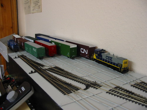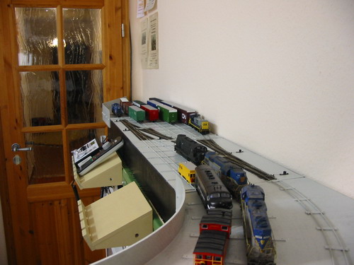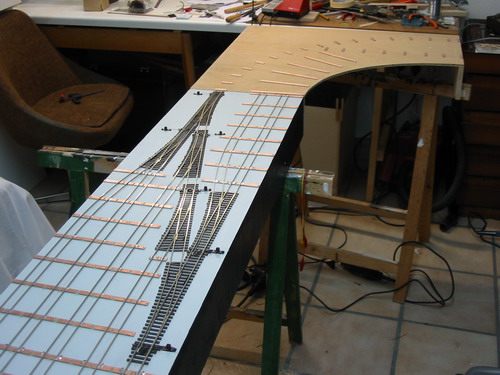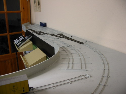 NEU 18.02.2008 Die Erweiterung des Schattenbahnhofes wurde fertiggestellt. Die Weichen sind Peco Streamline Code 75, Medium Radius. Die Weichen werden über kleine Schiebeschalter von Hand gestellt, gleichzeitig wird das Herzstück über den Schalter polarisiert. Die Gleise wurden sehr einfach und preisgünstig hergestellt, ME Code70 Profile auf zugesägten Pertinaxstreifen gelötet. An der Vorderseite wird noch eine Absturzsicherung angebracht, die Rückseite steht gegen die Wand im Anlagenzimmer. Durch das einsetzen weiterer Module liese sich der Schattenbahnhof auch beliebig verlängern. Mit dem Bau des 90° Anschlußmodul habe ich begonnen, der Radius beträgt 56cm, das ist das maximale was der Platz im Bastelzimmer her gibt...