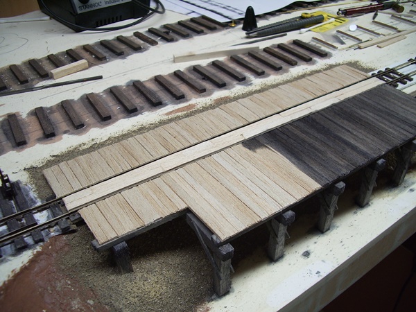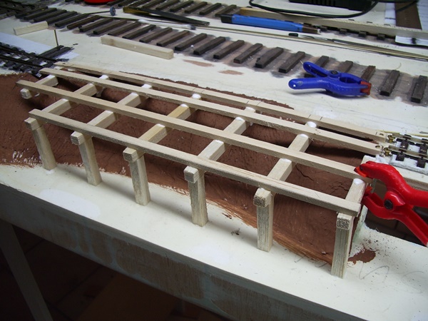 Pfahlstrecke gebaut, mit einer Holzplattform. Mit der Kaimauer aus Balsaholz habe ich angefangen...