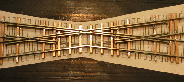 Die Selbstbaucrossing ist fertig und wurde zusammen mit der Selbstbauweiche eingebaut.Die Holzschwellen entstanden aus Balsaholz. Auf dem einen Bild ist schön zu sehen,