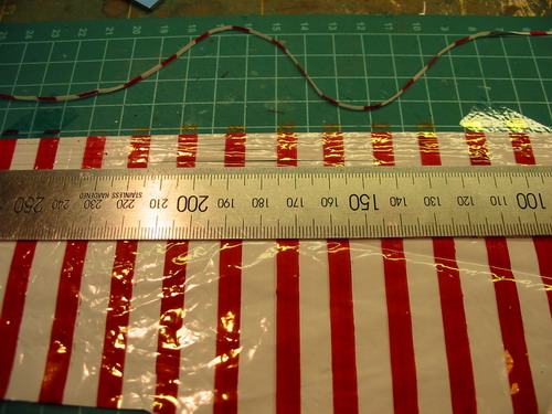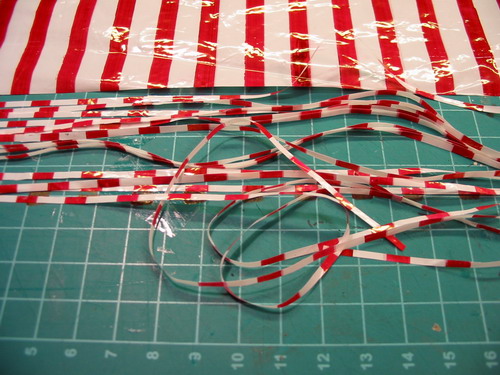 weisse Platiktüte genommen und im gleichmässigen Abstand rote Streifen mit einem wasserfesten Stift aufgemalt,