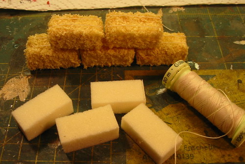 In letzter Zeit habe ich mich etwas um die Ausgestaltung der Bahn gekümmert. Es wurden Strohballen gebastelt, dafür habe ich aus Modur Klötze zugeschnitten und die mit Sägespähne beklebt danach erhielten sie noch einen Verschnürung aus Nähgarn... Einige MRRC Figuren wurden angemalt und aufgeklebt...