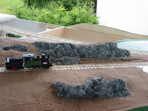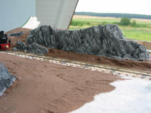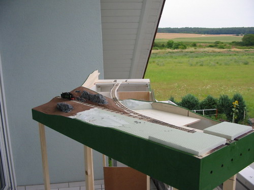 Die Bilder zeigen das Streckenmodul von dem das Gleis ansteigend in den Steinbruch abzweigt, die eigentlichen Steinbruchmodule sind im Rohbau fertig und die notwendigen Weichen gebaut.