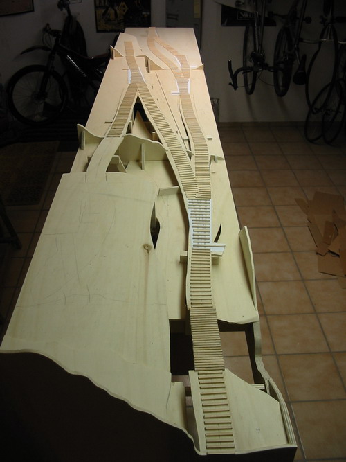 Die Segmentkästen sind aus 16mm Multiplex, die Trasse besteht aus 6mm Sperrholz. Die Beine sind